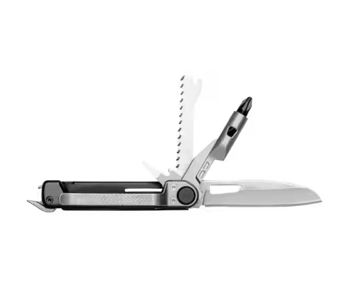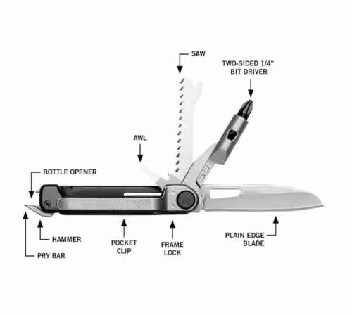 - Additional tools include a 2.5 in. plain edge blade, awl, saw and a bottle opener/prybar