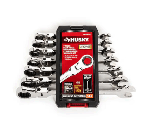 The versatile design of the 180° flexible head on these Husky ratcheting wrenches allows you to reach even the most troublesome fasteners. Their ratcheting box-end design needs only 5° of rotation to engage fasteners and apply torque. Each wrench has a knurled side to its beam for easy identification of the ratcheting direction so you will exactly if you are tightening or loosening the fastener.