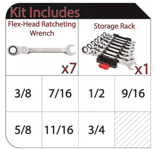 - 7-piece set includes flex-head ratcheting wrenches covering sizes 3/8″, 7/16″, 1/2″, 9/16″, 5/8″, 11/16″, and 3/4″