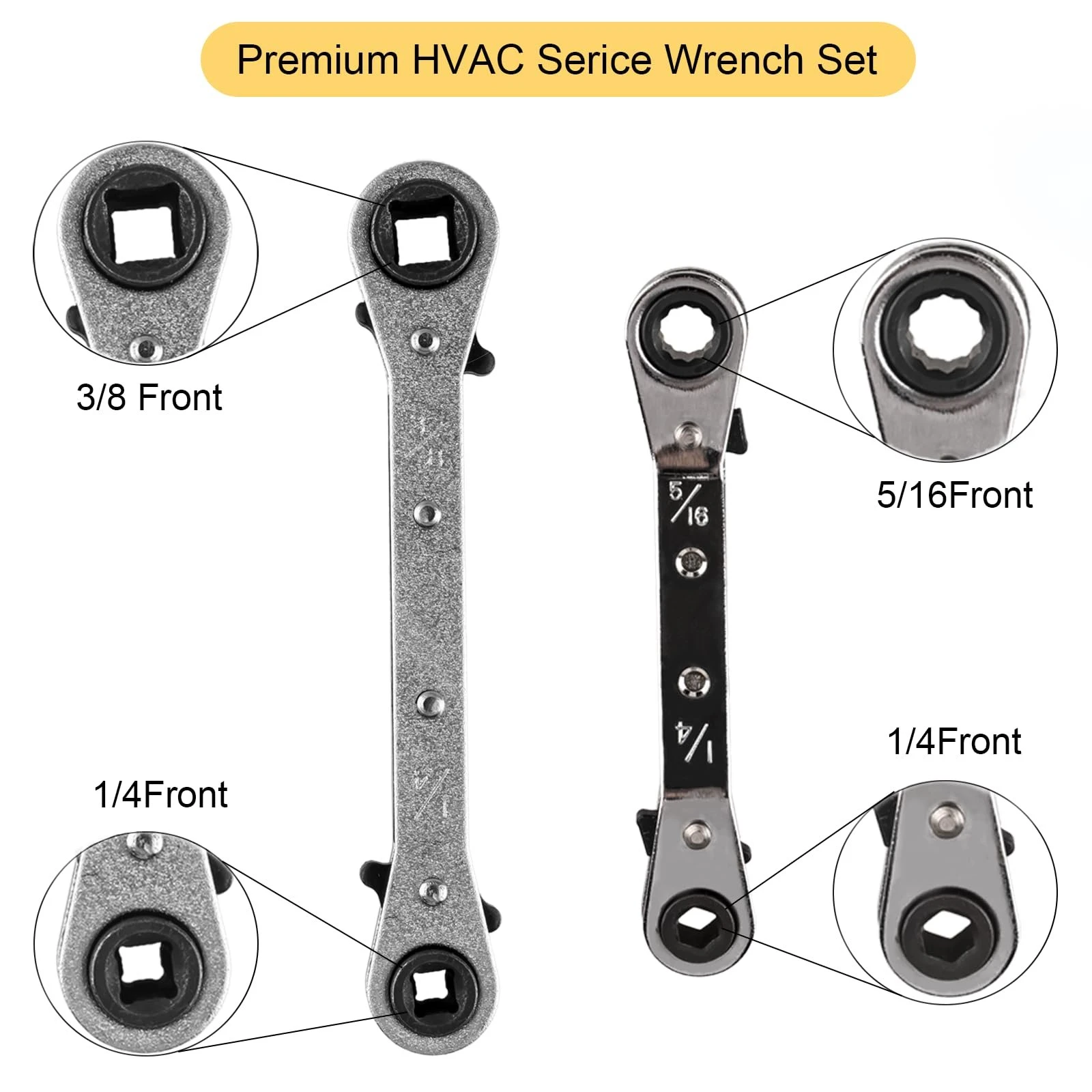 - What You Get: Package include 1pc Valve Core Remover Installer Tool, 1pc 1/4 & 5/16 HVAC service wrench, 1pc 3/8” to 1/4”, refrigeration service wrench, 2pcs hex bit adapters and 10pcs valve core