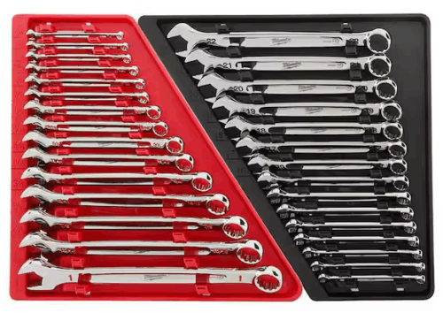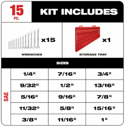 The MILWAUKEE Metric and SAE 15 Piece Combination Wrench Sets are designed from the ground up for mechanical and automotive tradespeople to deliver maximum torque and ultimate user comfort. The MAX BITE Open-End Grip improves the open end wrench’s grip on nuts and bolts, and the geometry reduces rounding and stripping. MAX BITE offers 25% More Torque than competitive combination wrench designs. The Comfortable I-Beam Handle Design allows superior user comfort, even while applying high torque. The mechanic’s combination wrench sets feature Ink-Filled Size Labels for easy size identification and a quick distinction between metric and SAE sets. The two 15pc wrench kits come in a storage tray designed for long-term storage, keeping the tool chest organized. Milwaukee Tool stands behind their products, offering a Lifetime Guarantee on both of the Combination Wrench Sets.