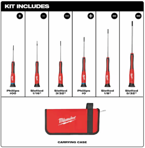 Milwaukee Precision Screwdrivers feature an All-Metal Core for up to 4X strength. Precision machined tips provide secure fitment and long life. The extended reach design and longer shanks deliver improved visibility and reach. 360° rotating back caps offer greater control, driving ability, and tuning. Additionally, color coded markings allow users to easily ID tool on the jobsite. Chrome plated shanks increase tool life by reducing corrosion and providing superior rust protection.